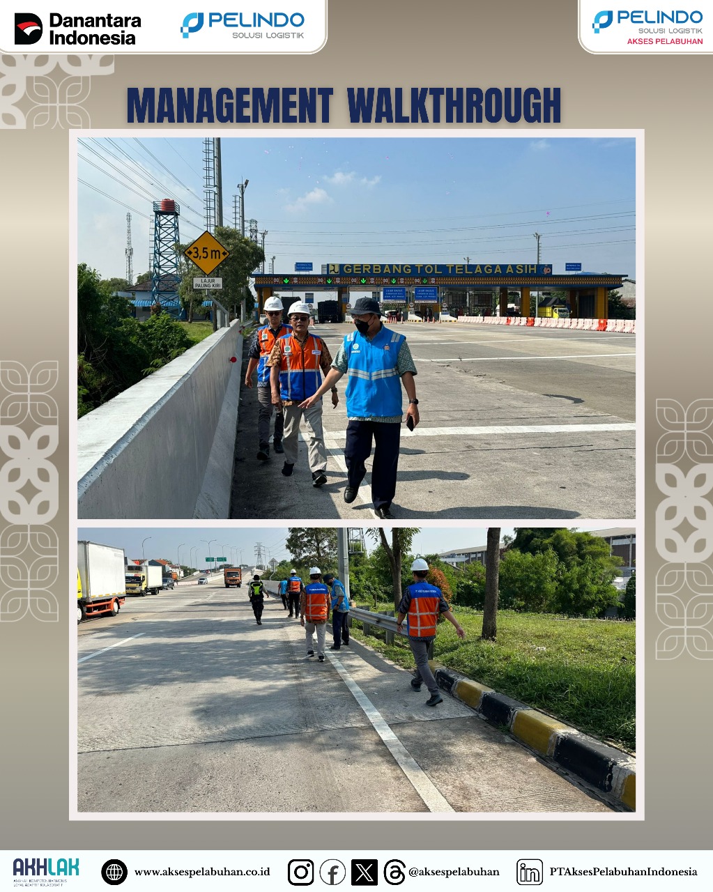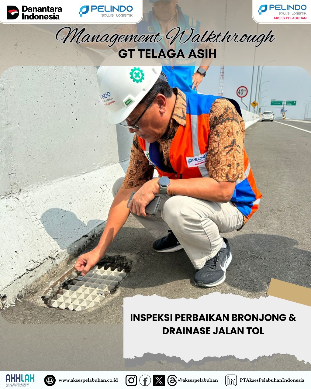 Jakarta, 18 September 2025. PT Akses Pelabuhan Indonesia atau API merupakan Anak Perusahaan dari PT Pelindo Solusi Logistik (SPSL), subholding PT Pelabuhan Indonesia (Persero), melaksanakan kegiatan Management Walkthrough (MWT) di Seksi 1 Gerbang Tol (GT) Telaga Asih, Bekasi pada tanggal 15 September 2025, dalam rangka meninjau langsung kondisi lapangan serta memastikan kelancaran perbaikan bronjong (penahan tanah) dan struktur jalan tol yang menjadi bagian penting dalam menjaga keamanan dan kenyamanan pengguna jalan.